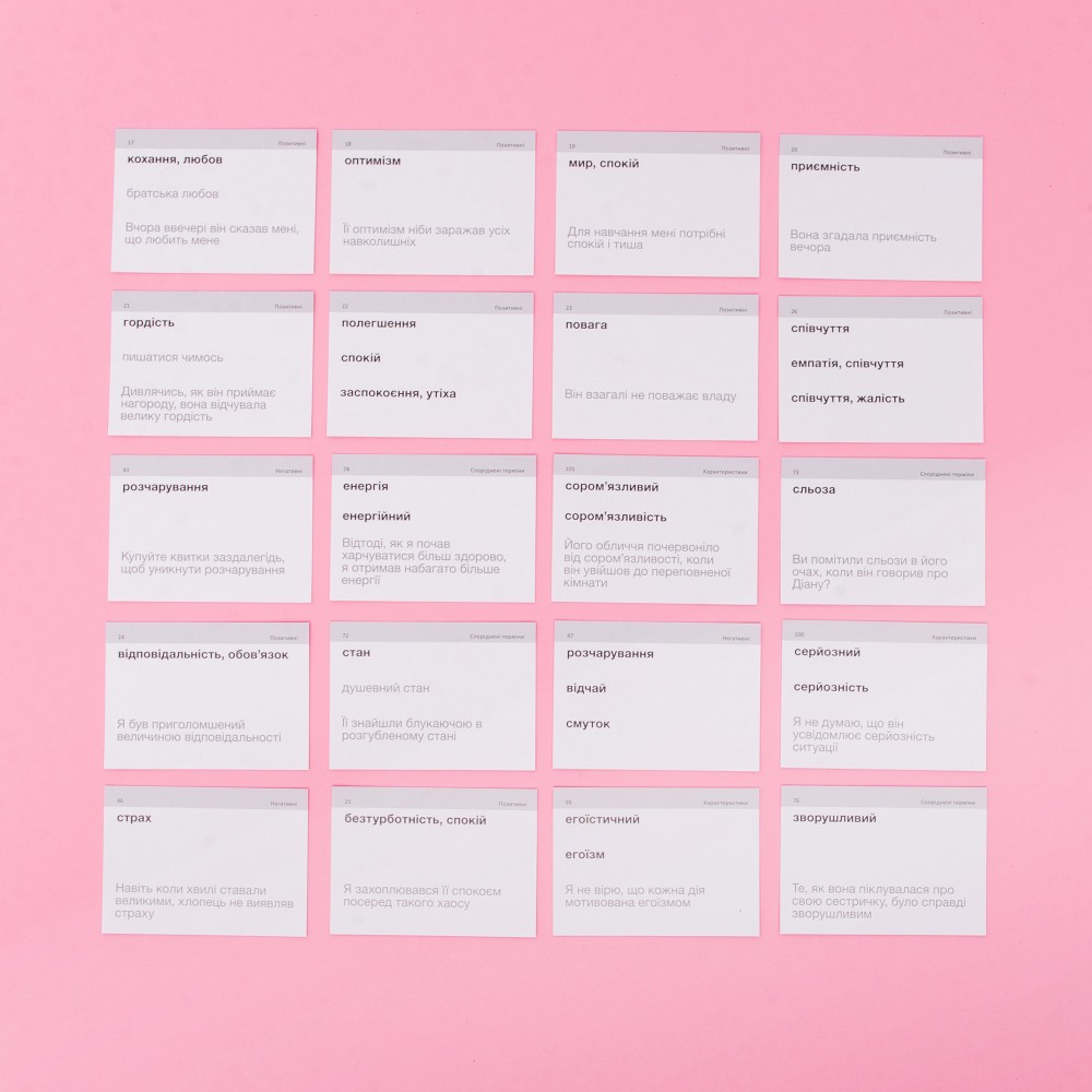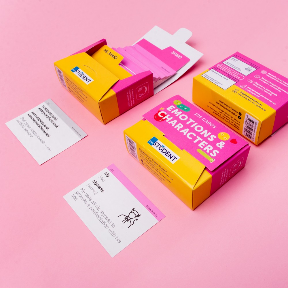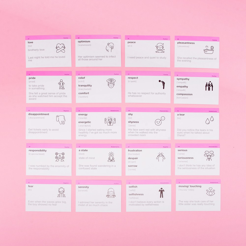Набор «Emotions & Characters» — набор с очень эмоциональной лексикой. На карточках мы собрали слова, которые описывают эмоции, состояния и характеристики. Идеально подойдет психологам и людям, которые интересуются ментальным здоровьем.