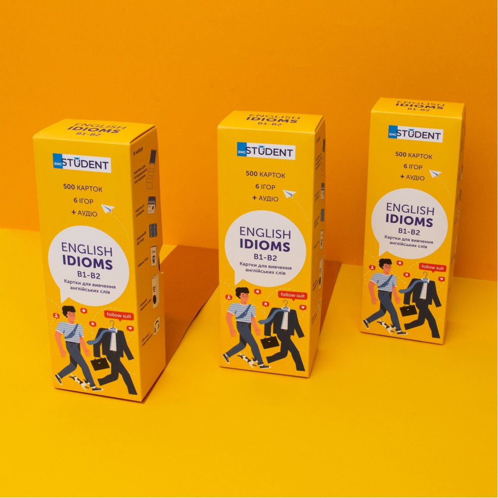 «English Idioms B1-B2» — набор карточек для изучения английских идиом средней сложности. Здесь собраны самые популярные идиомы, пословицы и устойчивые выражения на английском и соответствия на украинском. Выбирают те, кто хочет глубже ознакомиться с темой идиом.