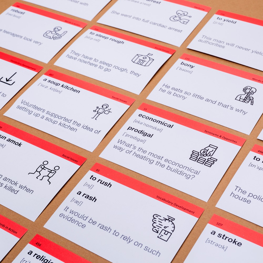 Набор карточек для изучения английского включает: 500 карточек, коробка для интервальных повторений, дорожный футляр и сборник игр.