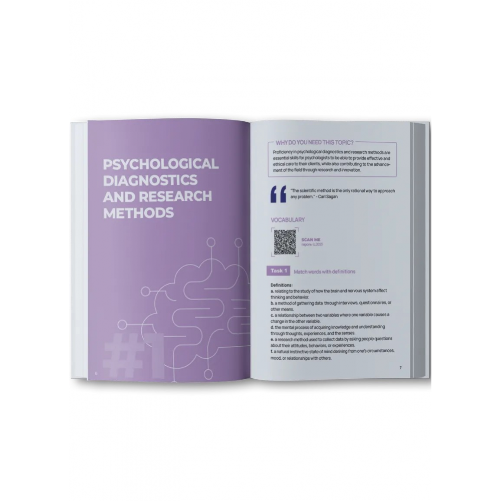 «English for Psychologists» — воркбук для изучения английского языка для тех, кто уже работает или учится в сфере психологии и хочет улучшить свой профессиональный английский. Также рабочая тетраль подойдет и тем, кто интересуется этой темой или просто хочеш лучше понять особенности ментального здоровья.