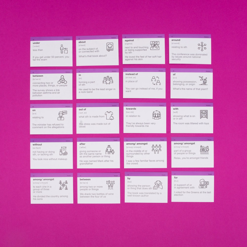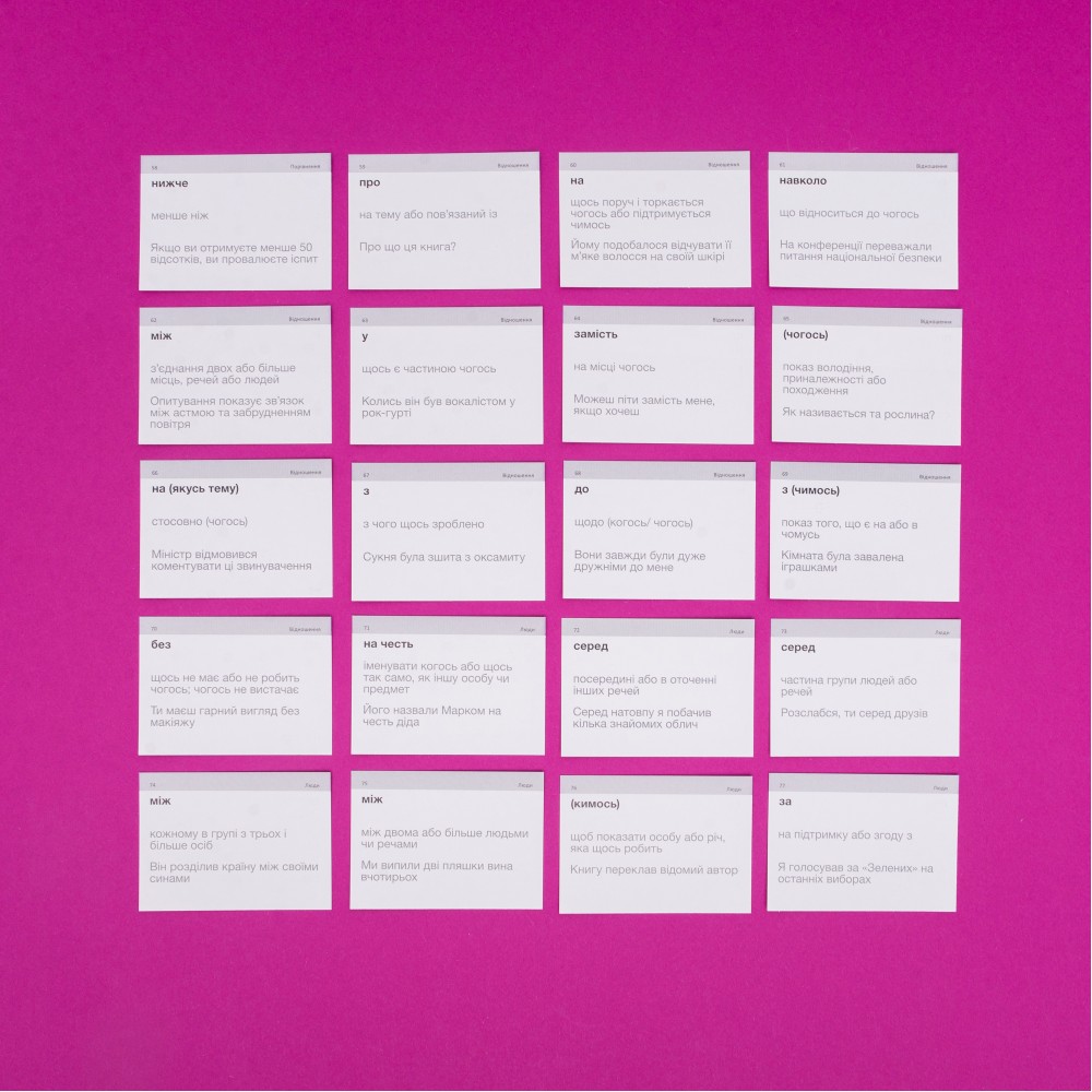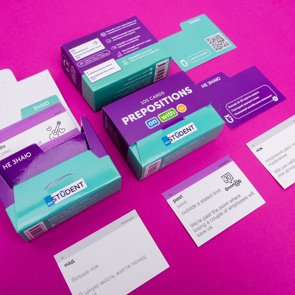 В наборе собрано 105 самых популярных предлогов. К каждому из них на карточке есть правило и пример употребления.
