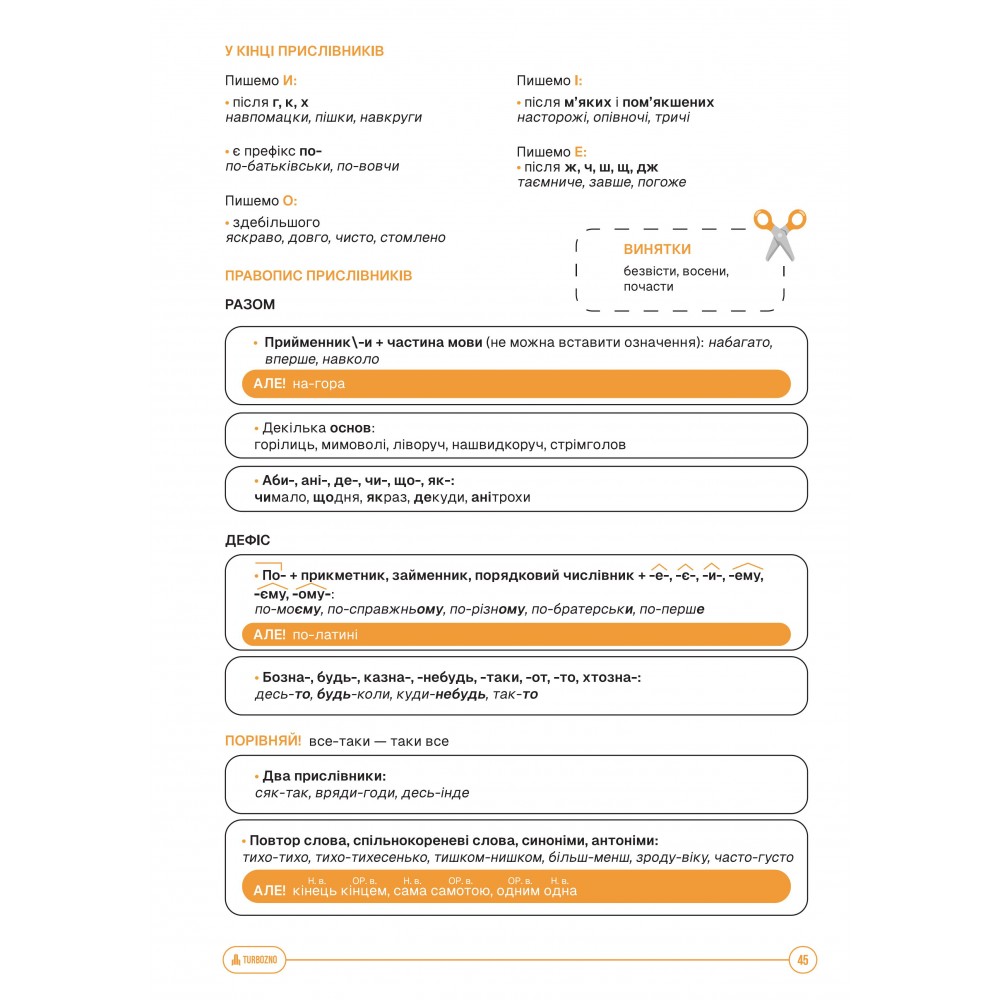 Конспект по украинскому языку по новому правописанию охватывает всю программу НМТ и помогает подготовиться без лишнего стресса. В нем – четкая структура, авторские объяснения, понятные примеры, практические задания и тесты по каждой теме. Вы найдете полный список ударений и фразеологизмов, нормы нового правописания с исключениями, которые легко запомнить или вырезать для быстрого повторения.