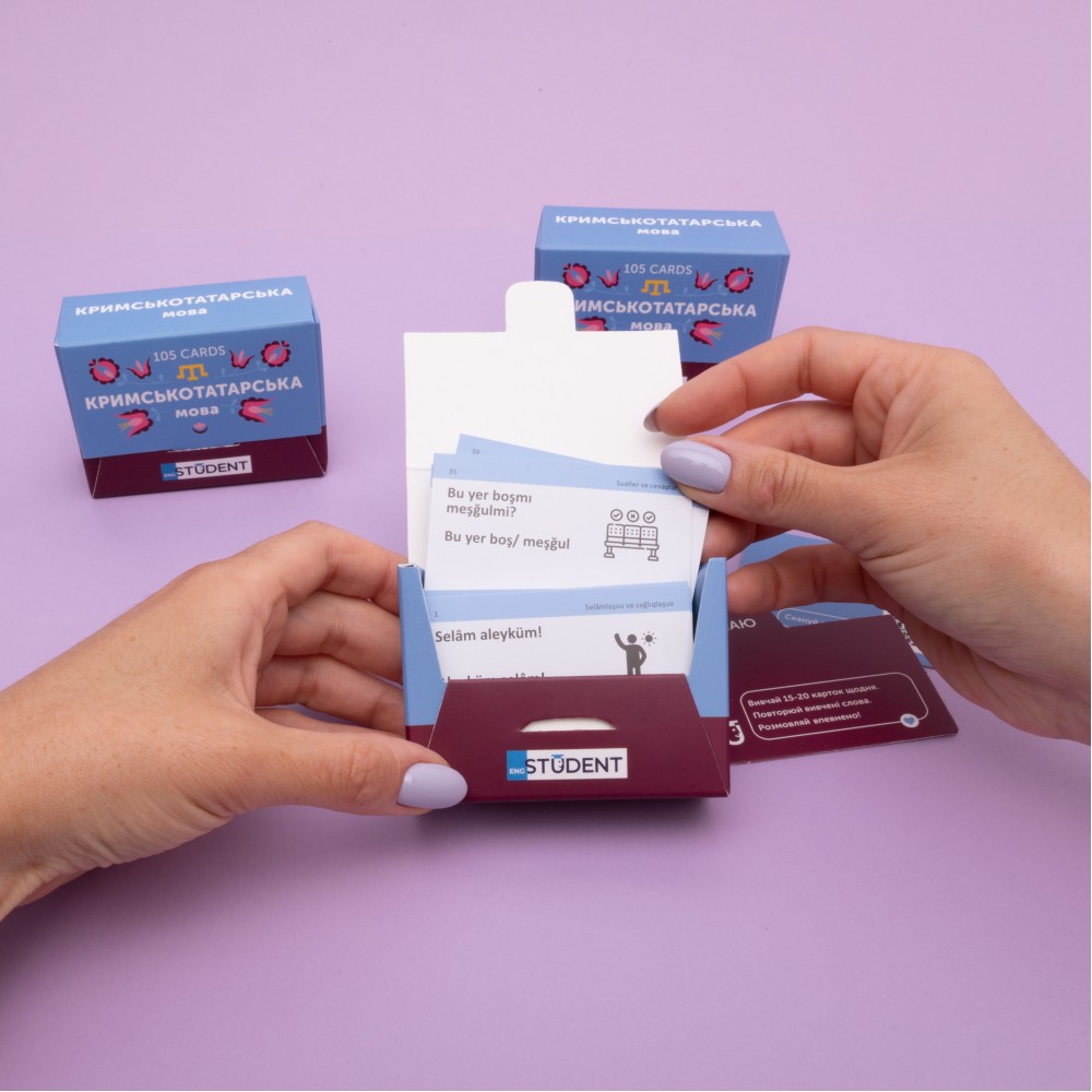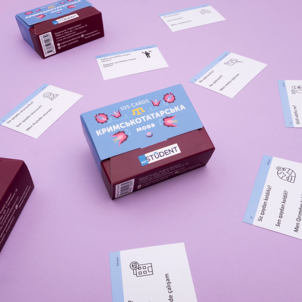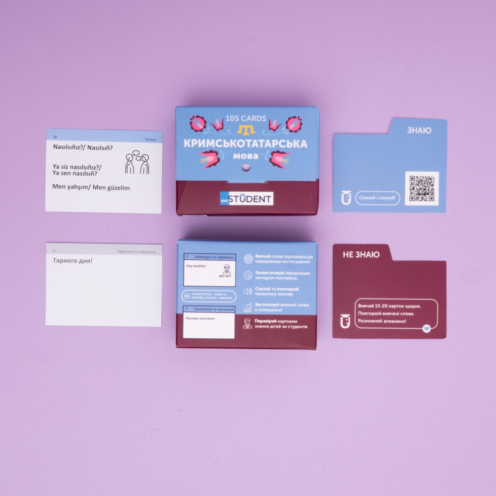 Набор для изучения крымскотатарского языка (уровень А1-А2) — карточки с фразами на каждый день. Для тех, кто хочет начать изучать крымскотатарский и больше узнать о культуре. почати вивчати кримськотатарську та більше дізнатися про цю культуру. 105 карточек с вопросами и популярными фразами помогут научиться вести обыденндые разговоры. К каждой карточке есть аудиосопровождение, которое дополнительно научить разбираться с правильным произношением и восприятием слов на слух.