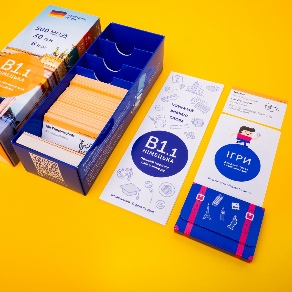 Набор немецкий В1.1 — первая часть среднего уровня. Предназначена для тех, кто уже освоил базовые уровни и хочет начать понимать других, смотреть фильмы и читать несложные тексты.Карточки уровня помогут освоить базовую разговорную лексику.