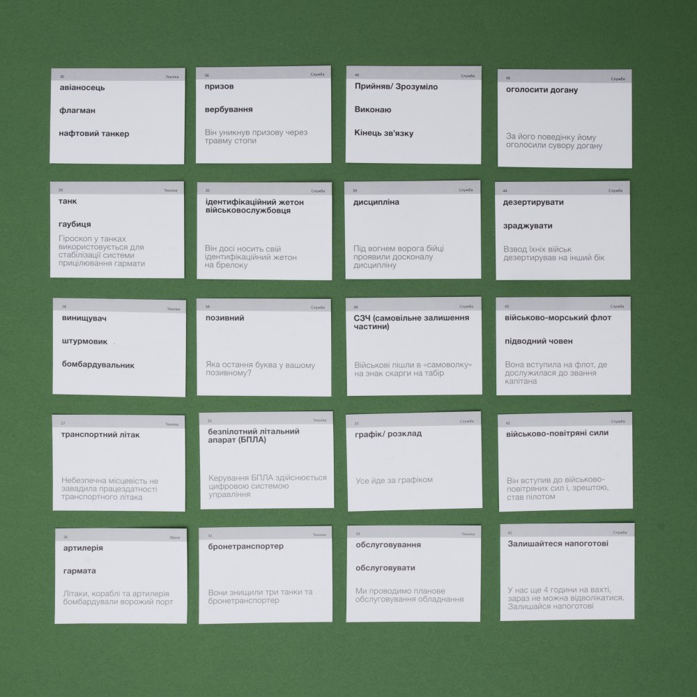 В наборе есть военные термины, которые обозначают звания, боевые действия, процессы и характеристики. Также к каждой карточке есть дополнительное аудиосопровождение.