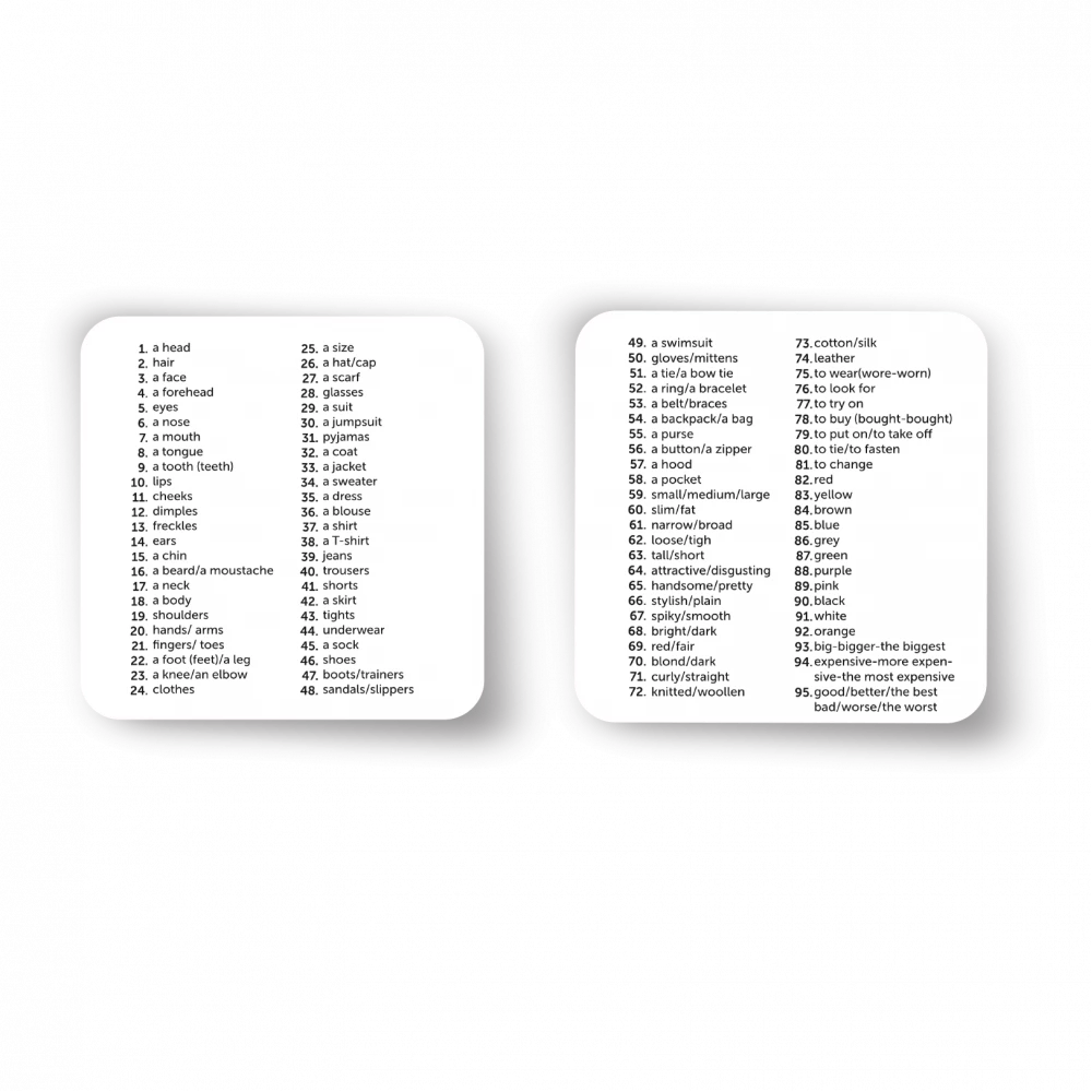 Тематический набор «Моя внешность» — это 95 карточек для работы со школьниками на уроках английского языка. Слова и примеры подобраны для учеников 3-5 классов по программе Министерства образования и науки. На одной стороне карточки — большое изображения предмета с темы, слово и транскрипция, на обратной стороне — несколько примеров словосочетаний и предложений в трех формах (утвердительной, отрицательной, вопросительной).