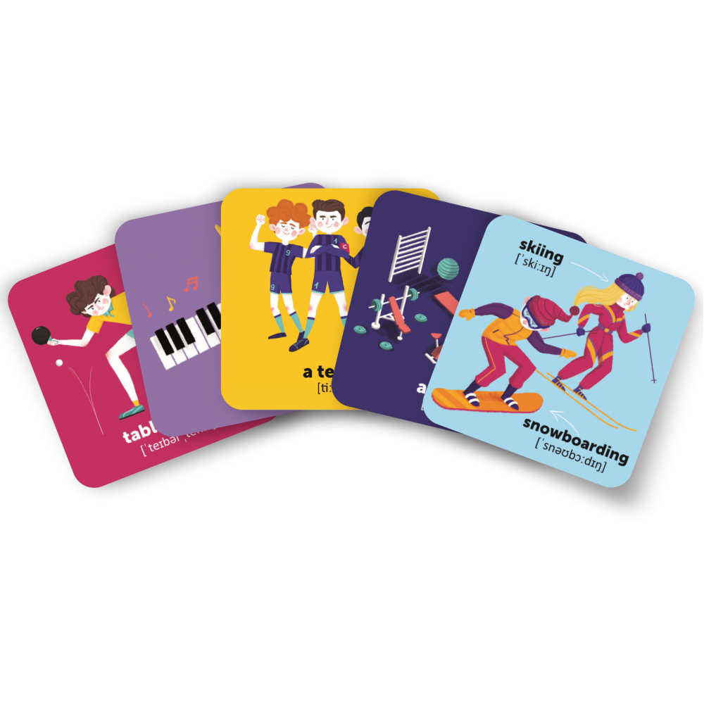 Тематический набор «Спорт и досуг» — это 95 карточек для работы со школьниками на уроках английского языка. Слова и примеры подобраны для учеников 3-5 классов по программе Министерства образования и науки. На одной стороне карточки — большое изображения предмета с темы, слово и транскрипция, на обратной стороне — несколько примеров словосочетаний и предложений в трех формах (утвердительной, отрицательной, вопросительной).