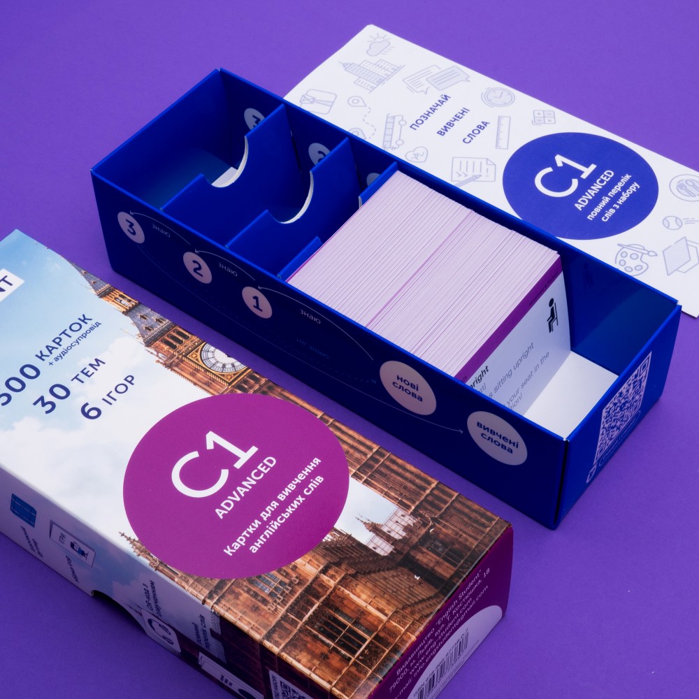 Каждый уровень английского включает: 500 карточек, коробку для интервальных повторений, дорожный футляр, QR-код с аудио и сборник игр.