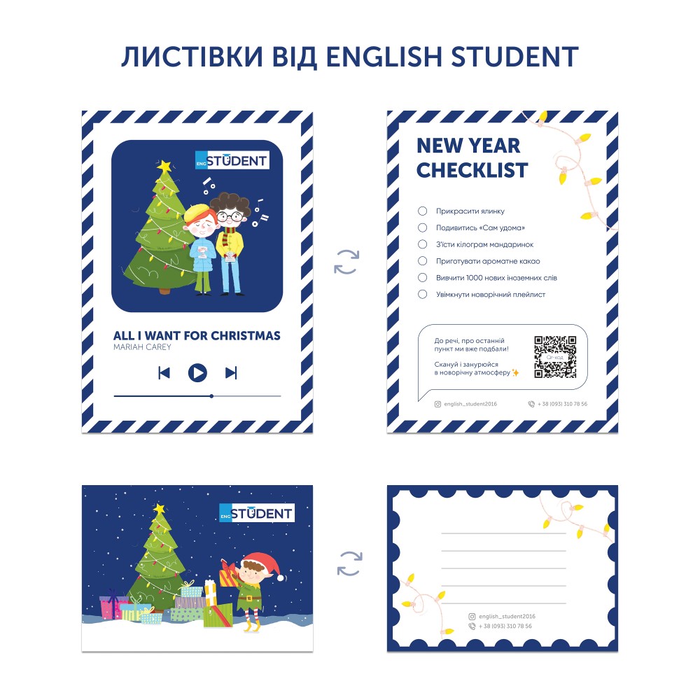 • дві листівки: одна з чеклістом справ і музики для святкового настрою, друга — для твоїх побажань (до речі, якщо замовляєш для когось у подарунок, можемо одразу підписати)