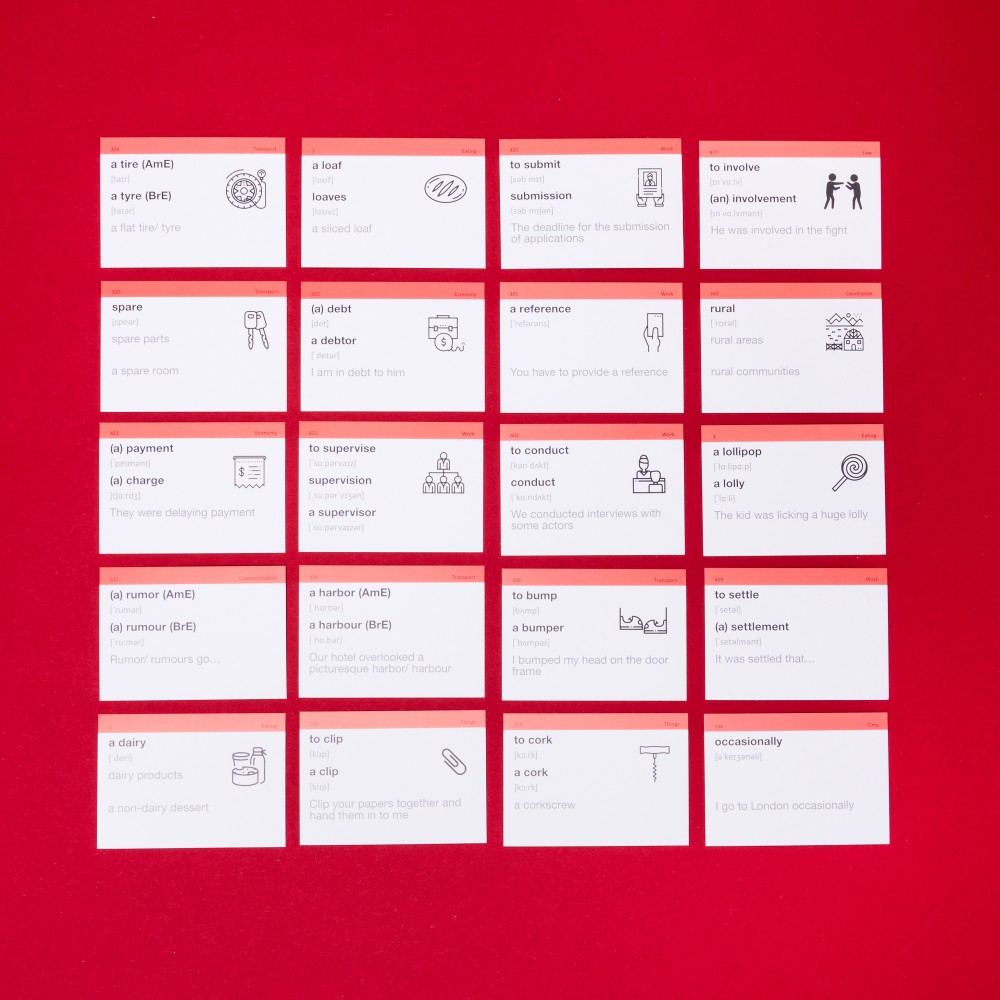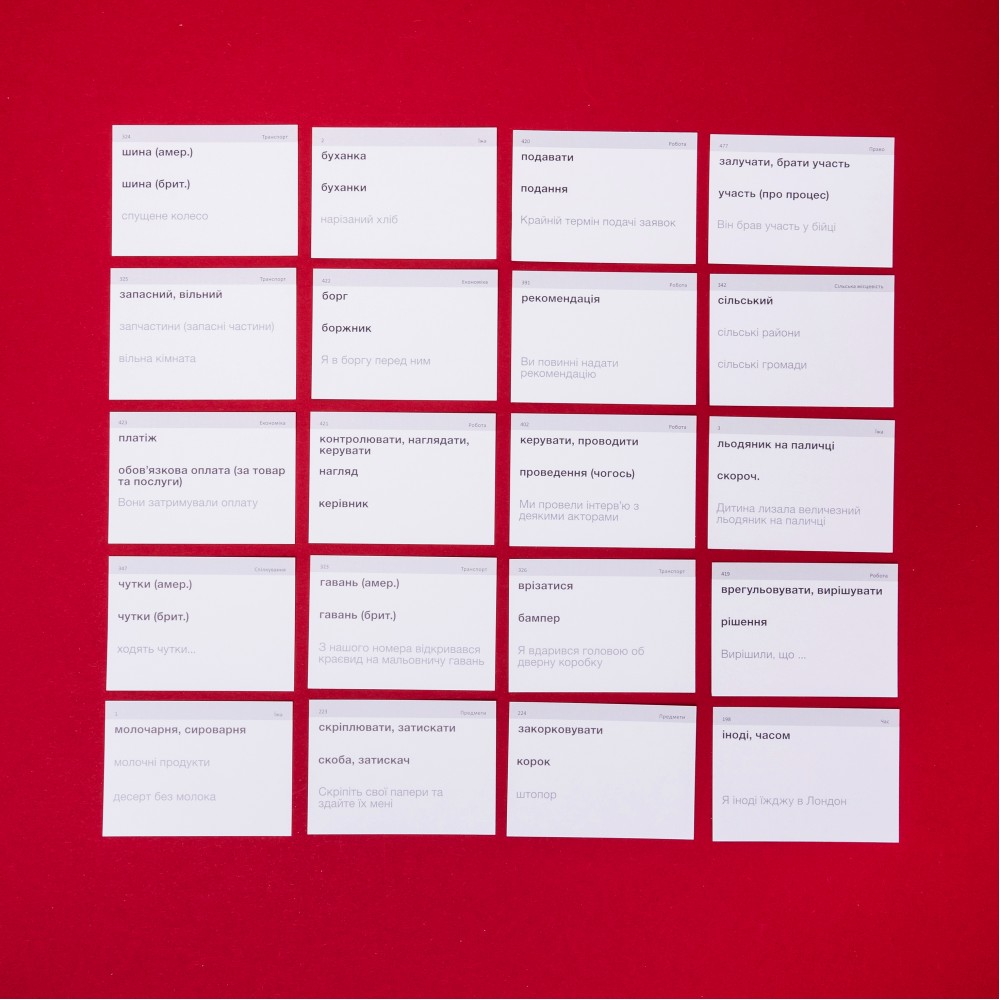 Кожен набір містить: 500 карток, коробку для інтервального повторення, дорожній футляр, QR-код з аудіосупроводо та збірку ігор.