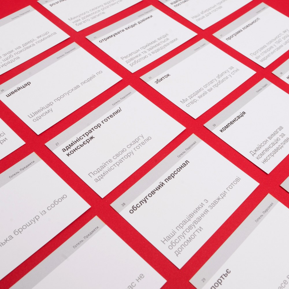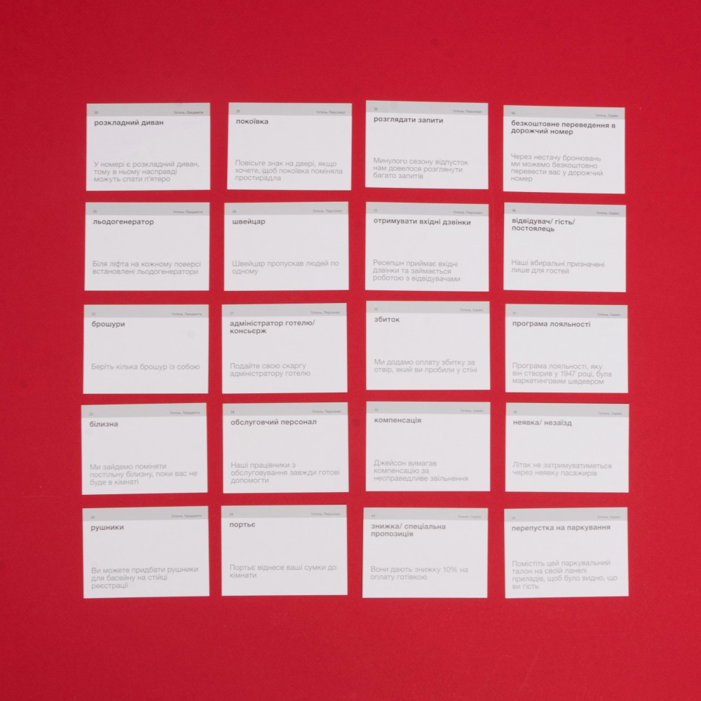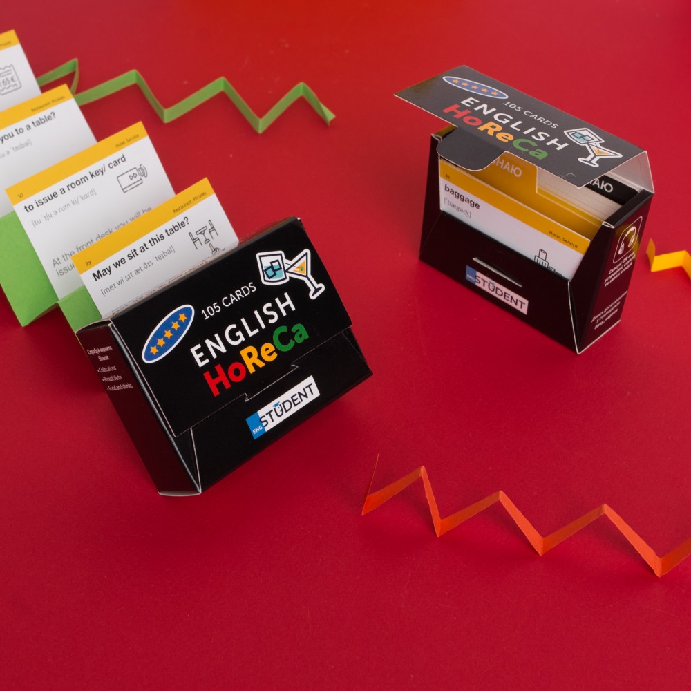Набір «HoReCa» (рівень А1-А2) — це набір англійських слів для працівників сфери обслуговування. HoReCa — це абревіатура, яка розшифровується як Hotel, Restaurant and Cafe, а саме робітники цієї галузі дуже зацікавлені в досконалому володінні англійською. Це руйнує мовний бар'єр між гостем та працівником та покращує рівень сервісу. У наборі є 105 карток із лексикою, яка допоможе порозумітися з клієнтами та почати підйом кар'єрною драбиною.