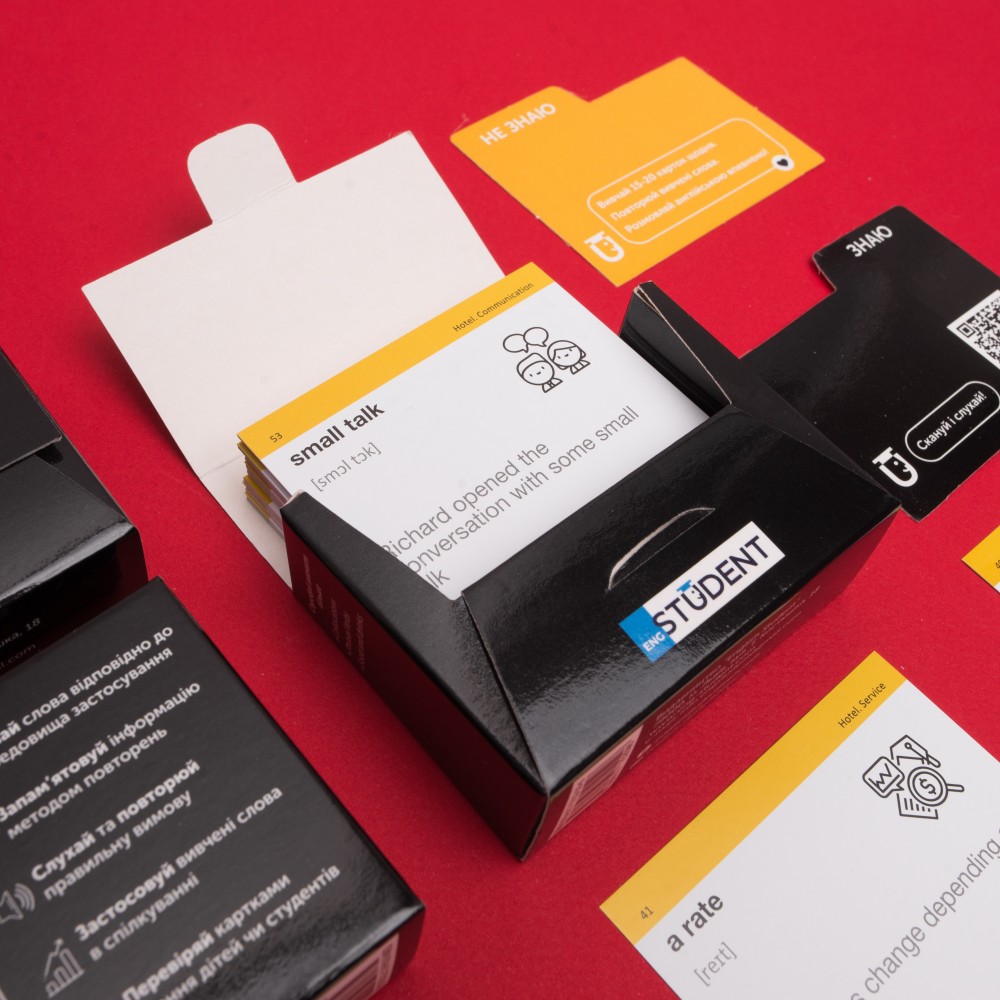 Кожен набір містить: 105 карток зі словами, спрощену версію коробки для інтервального повторення, 2 розділювачі («Знаю», «Не знаю»), QR-код з аудіосупроводом.