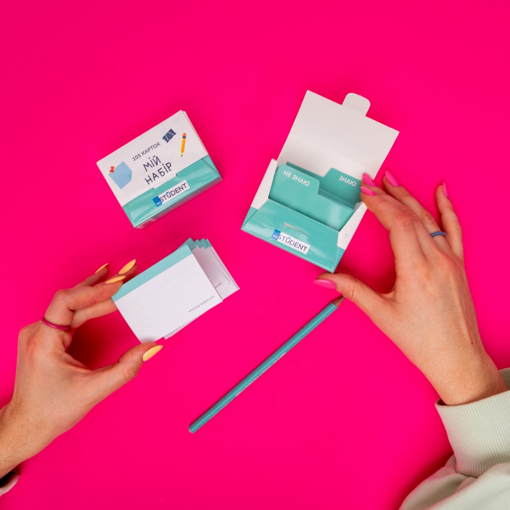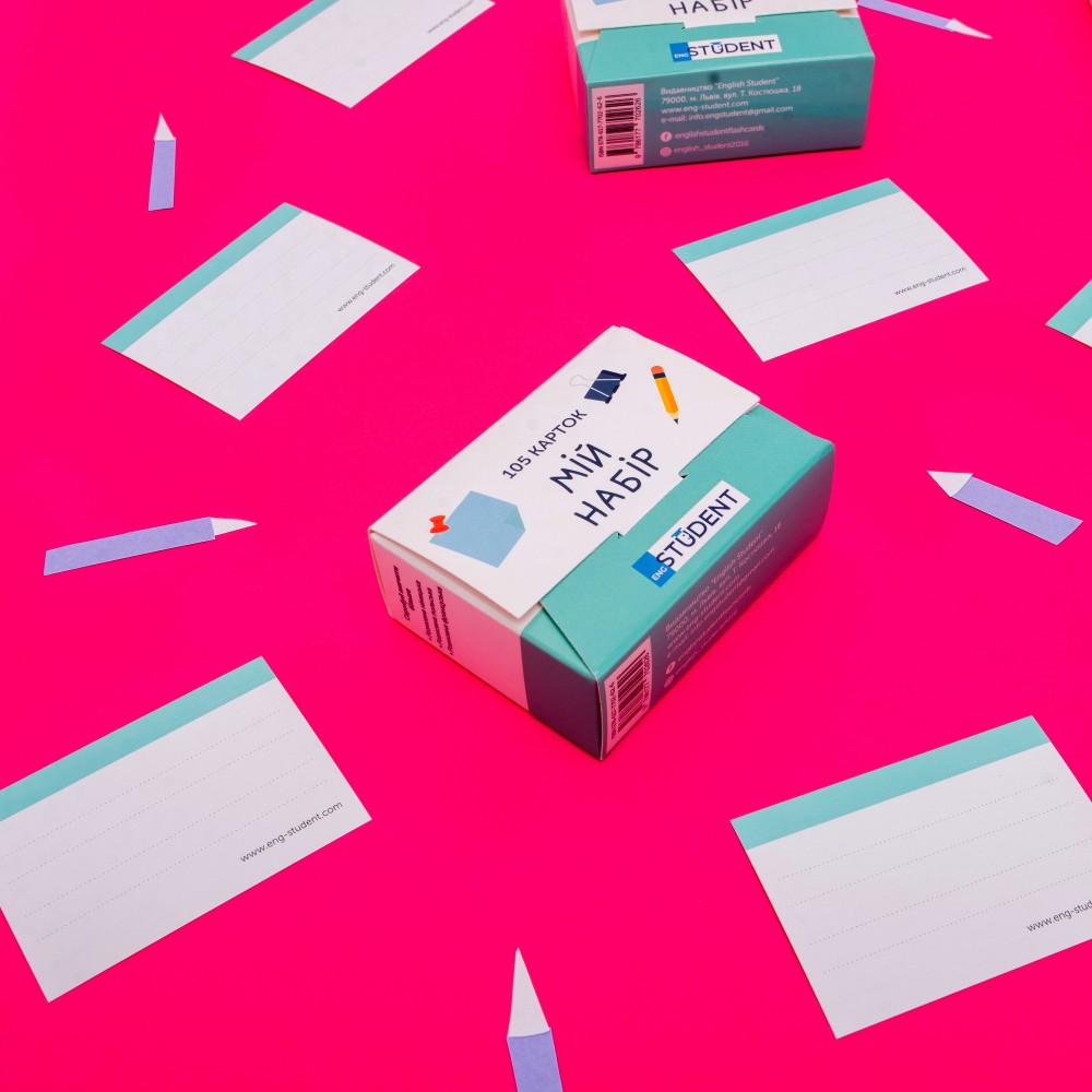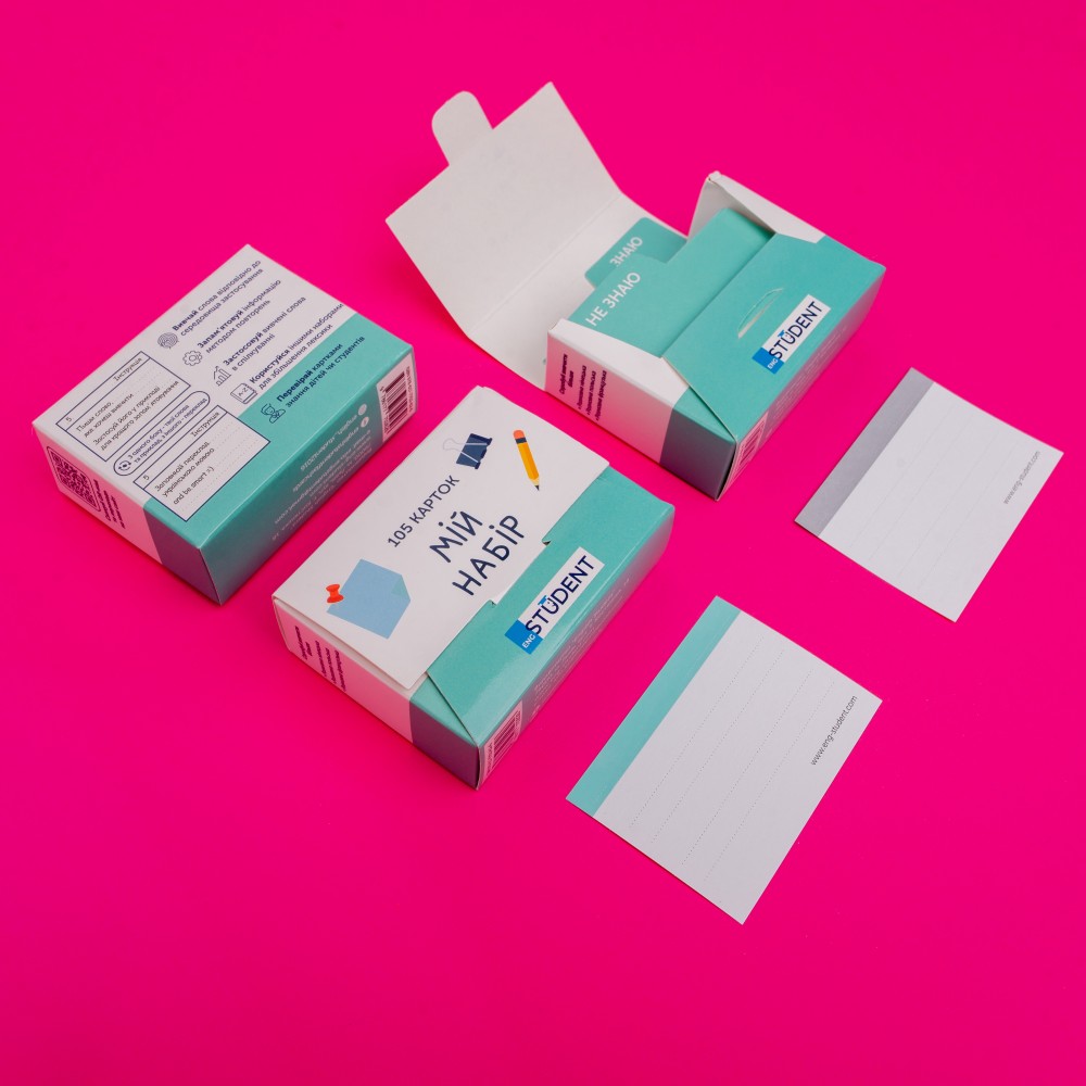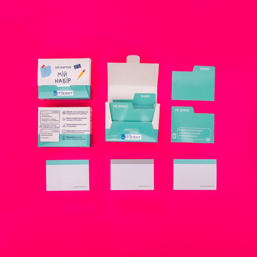Кожен набір містить: 105 незаповнених карток, два розділювачі «Знаю» та «Не знаю», спрощену версію коробки для інтервального повторення