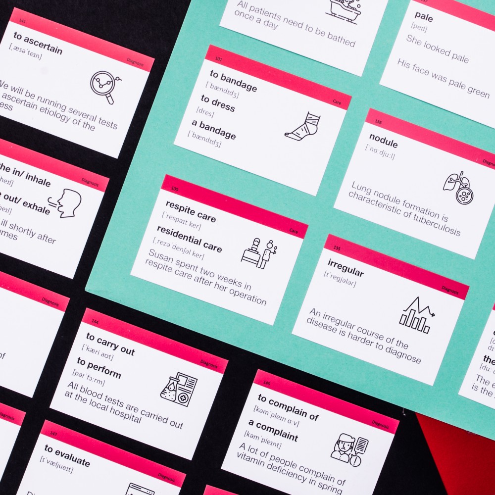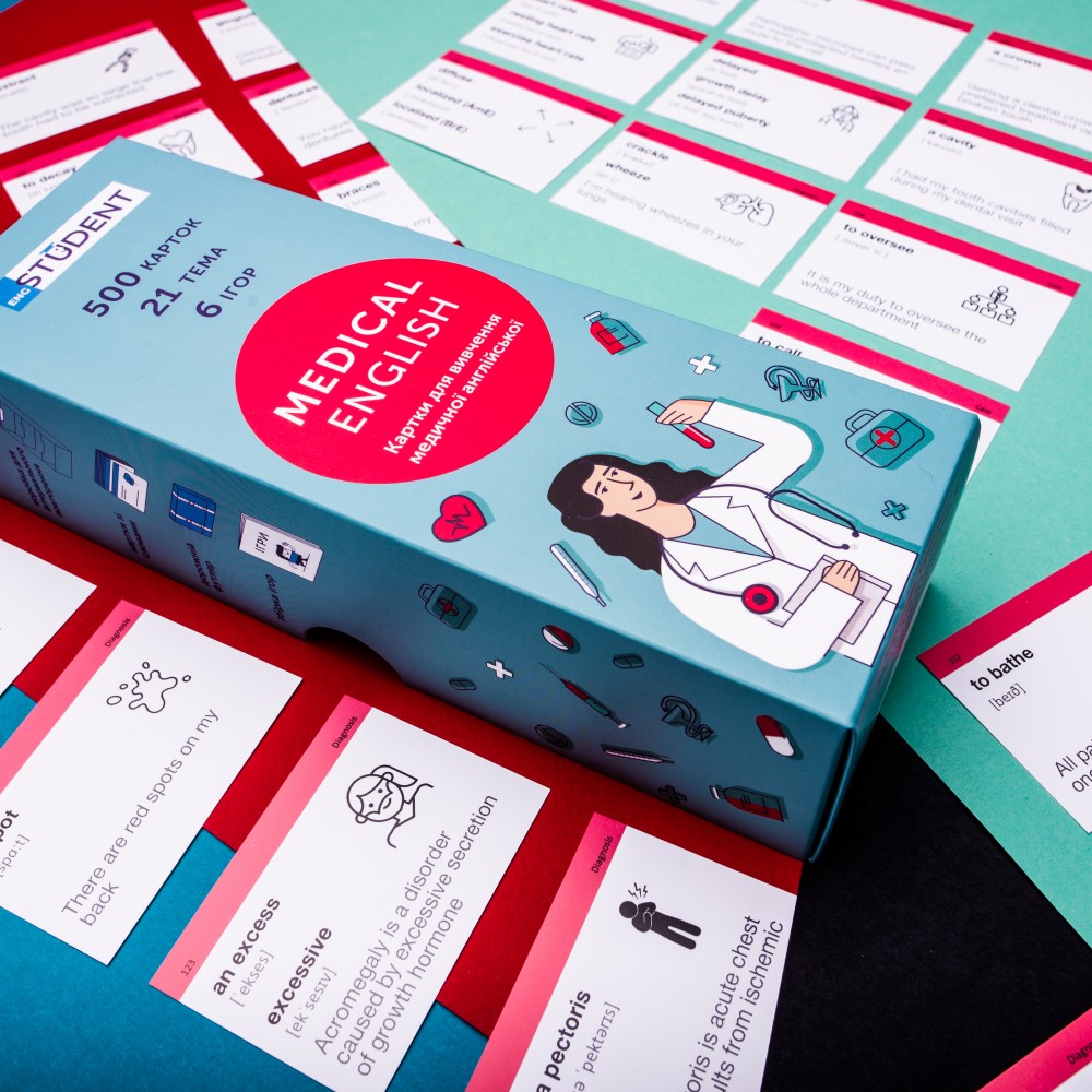 «Medical English» (рівень В1-С1) — картки англійських слів для медиків. Вибирають ті, хто хоче навчатись чи стажуватись за кордоном у сфері медицини та вільно спілкуватись на професійні теми. У цьому наборі 794 англійських слова та 491 приклад їх вживання.