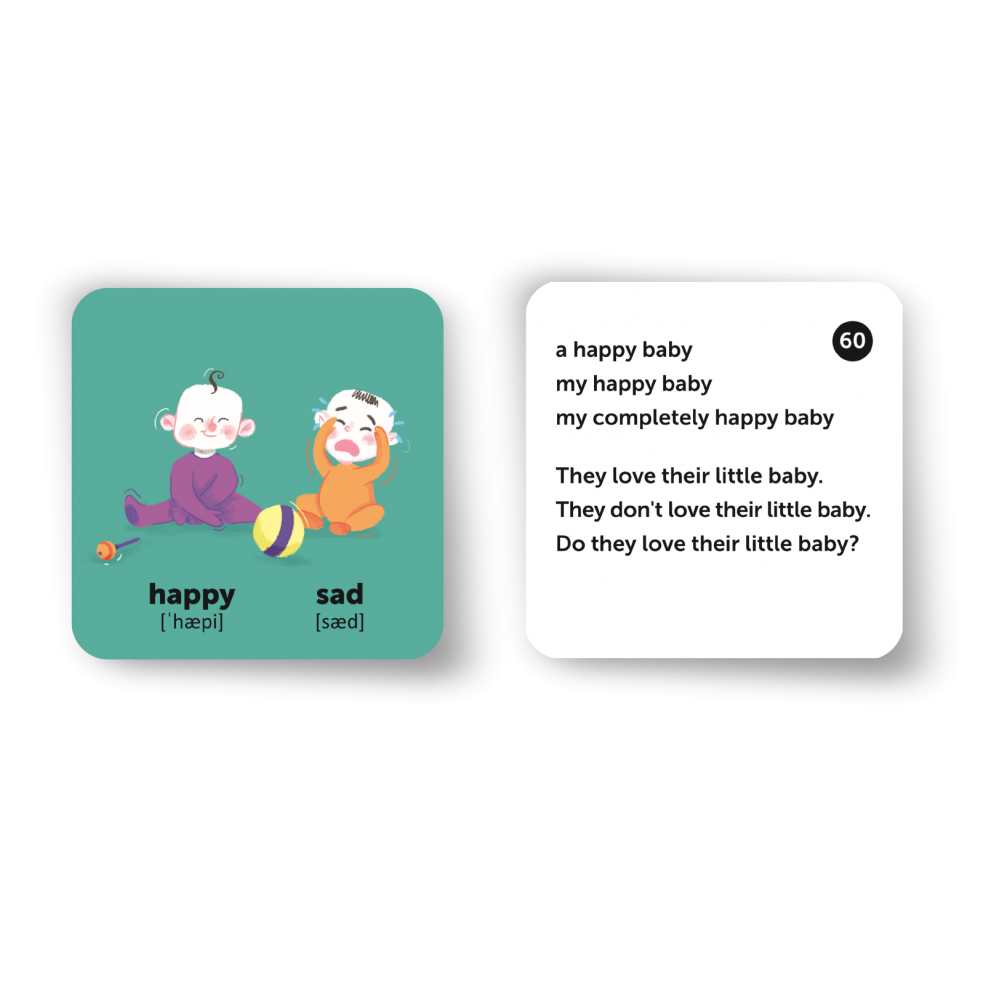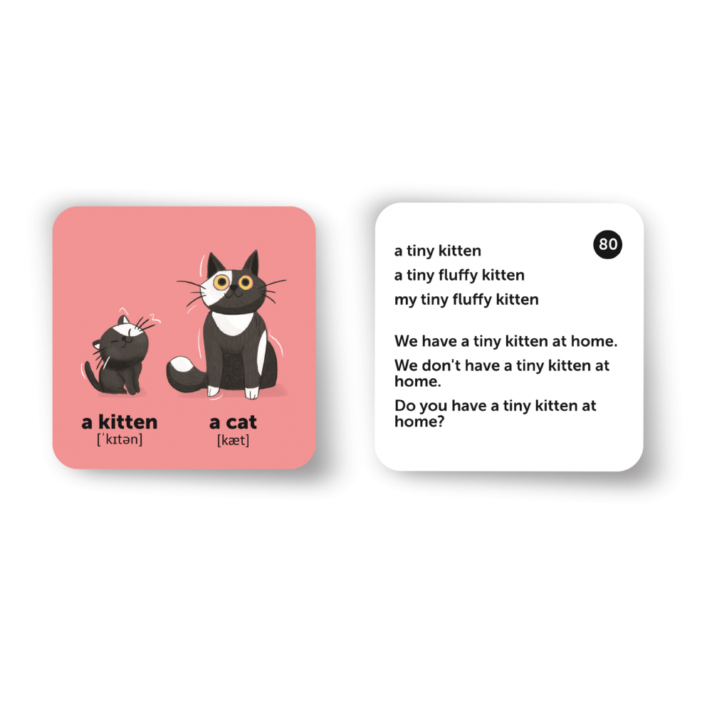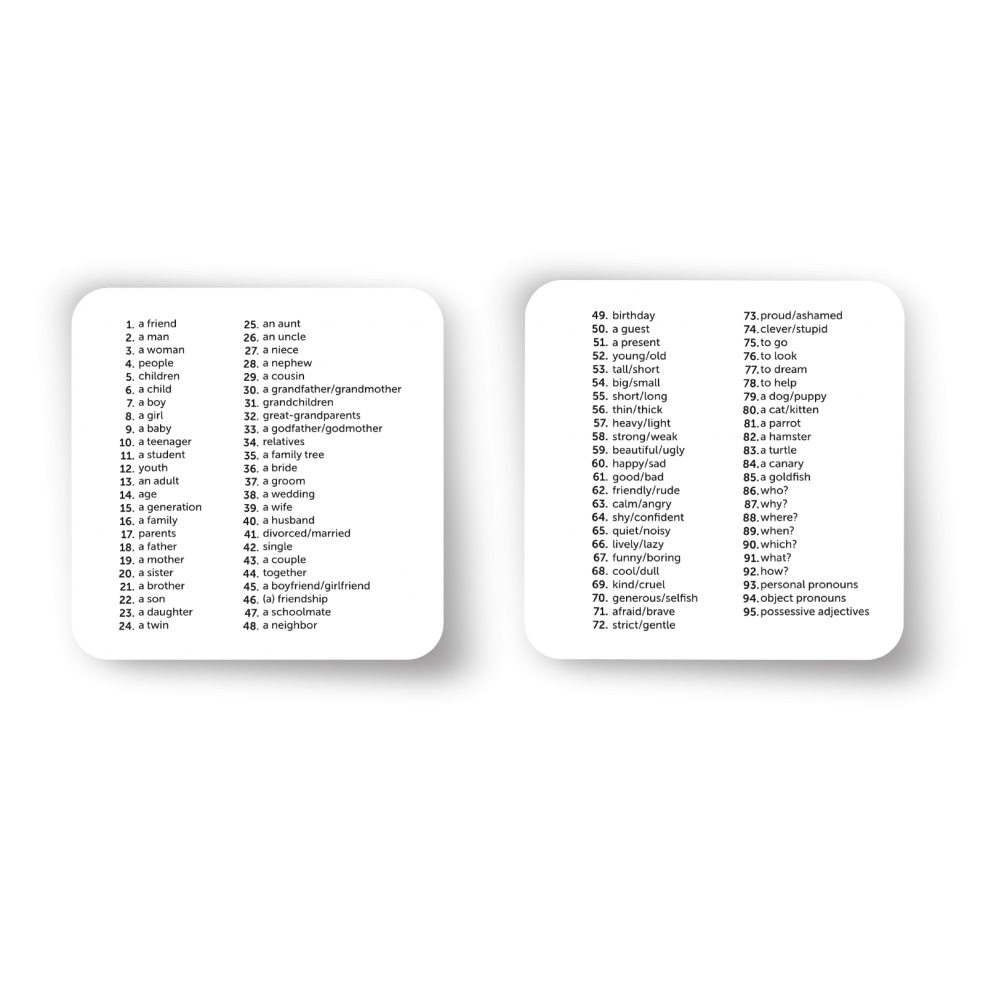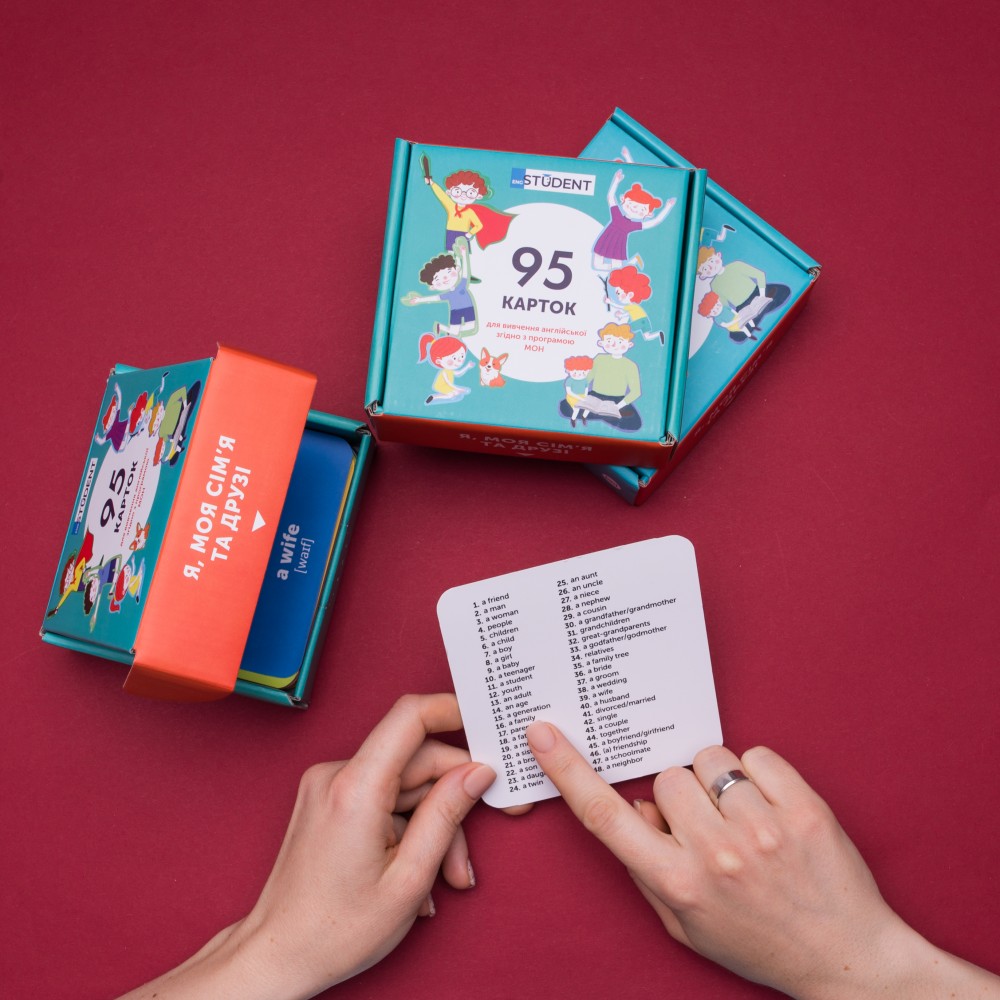 Тематичний набір «Я, моя сім’я та друзі» — це 95 карток для роботи зі школярами на уроках англійської. Слова та приклади підібрані для учнів 3-5 класів згідно з програмою Міністерства освіти та науки. На одному боці картки — велике зображення предмета з теми, слово та транскрипція, на звороті — декілька прикладів словосполучень та речення у трьох формах (стверджувальній, заперечній, запитальній).