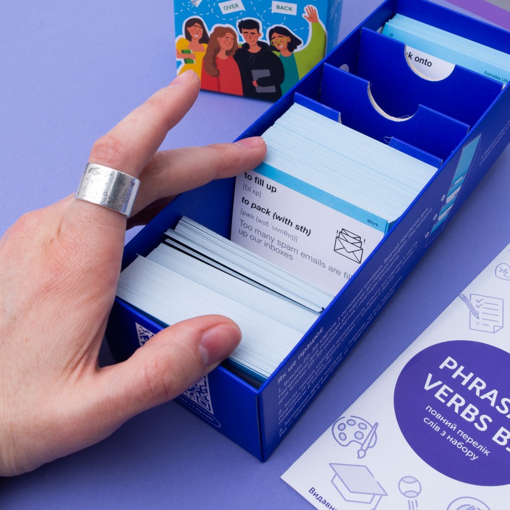 Набір «Idioms & Phrasal verbs» — картки для вивчення англійських ідіом і фразових дієслів рівня В1-B2. У комплекті зібрані найбільш вживані фразові дієслова та англійські ідіоми з українськими відповідниками, які допоможуть твоїй англійській level up. Тебе більше не збиватимуть із пантелику фрази на кшталт «to rain cats and dogs», «to sit on the fence» чи «like talking to a brick wall». А значення фразових дієслів не доведеться вгадувати з контексту.
